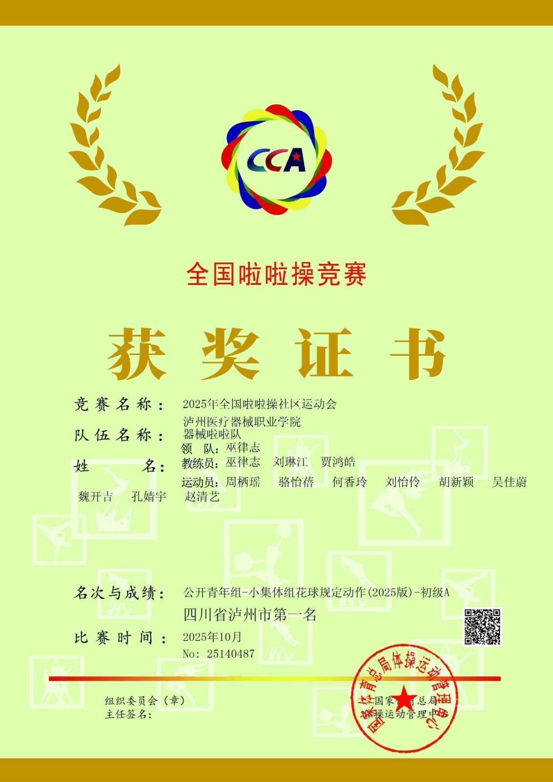 近期,由國家體育總局主辦的全國啦啦操社區(qū)運動會圓滿落幕。瀘州醫(yī)療器械職業(yè)學院精心選拔9名同學組成器械啦啦隊參加兩個項目的比賽。